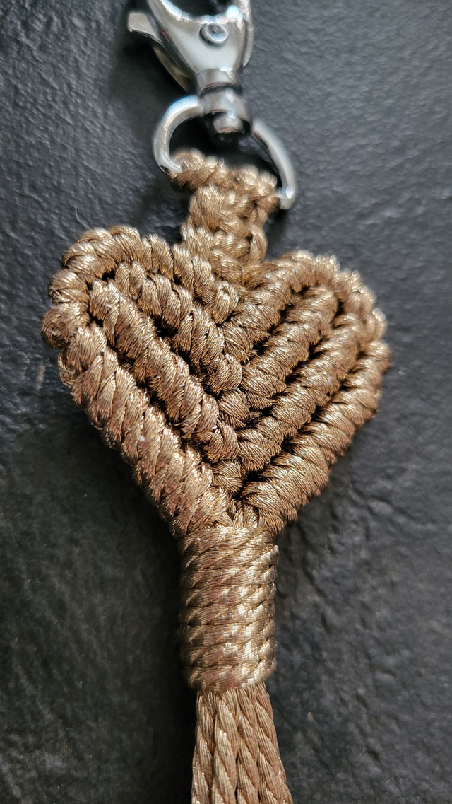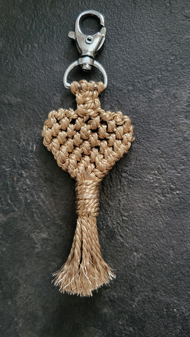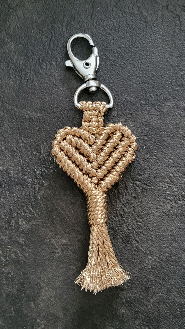 Porte-clé en macramé réalisé à la main avec un magnifique fil doré (effet cuivré). Un cadeau original qui ravira celles et ceux que vous aimez !